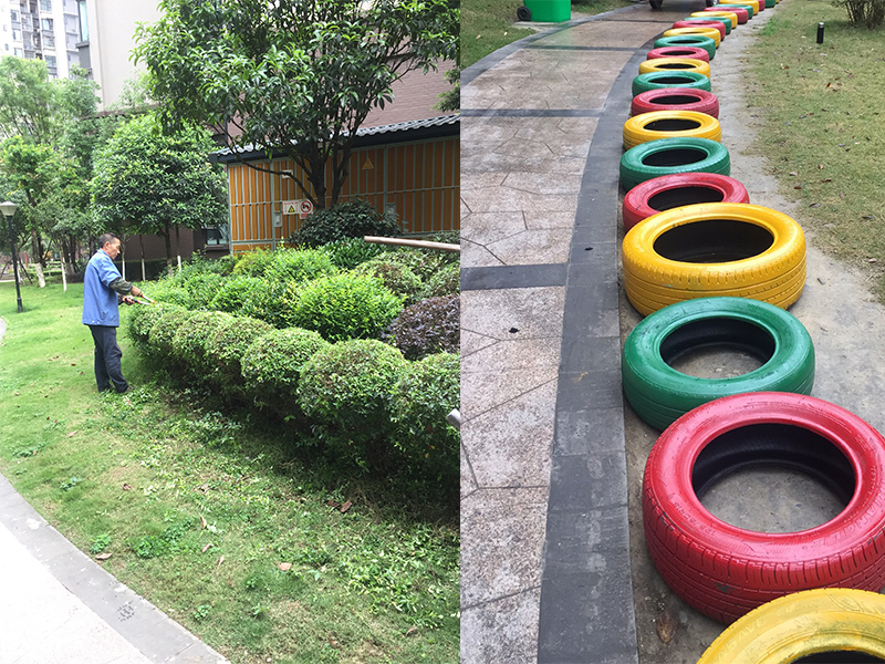 降低費用、提升品質,物業(yè)的能工巧匠們用行動踐行著他們的使命。在綠化邊緣筑起隔離帶,防止雨水濺起泥垢;利用刷漆的廢舊輪胎種上各類綠植,在各小區(qū)形成一道道別致的景觀。